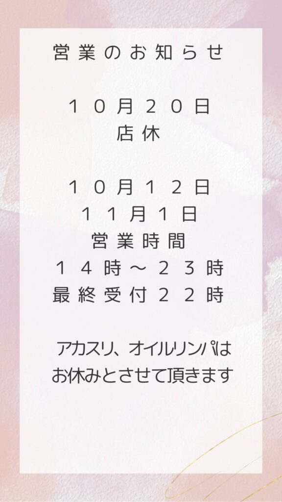 10月12日 、11月1日 ※アカスリ・オイルリンパはお休みさせて頂きます。