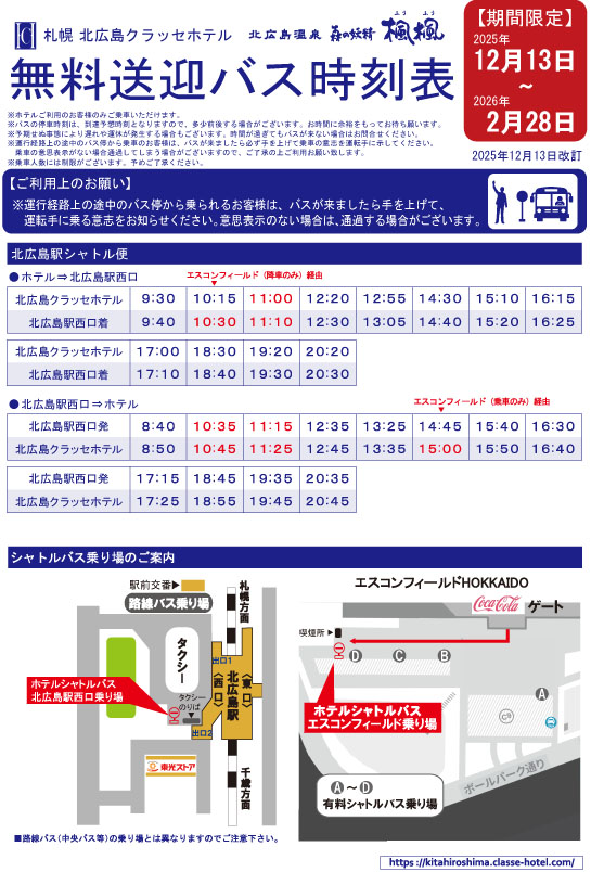 2025/12/13~2026/2/28 無料送迎バス時刻表
